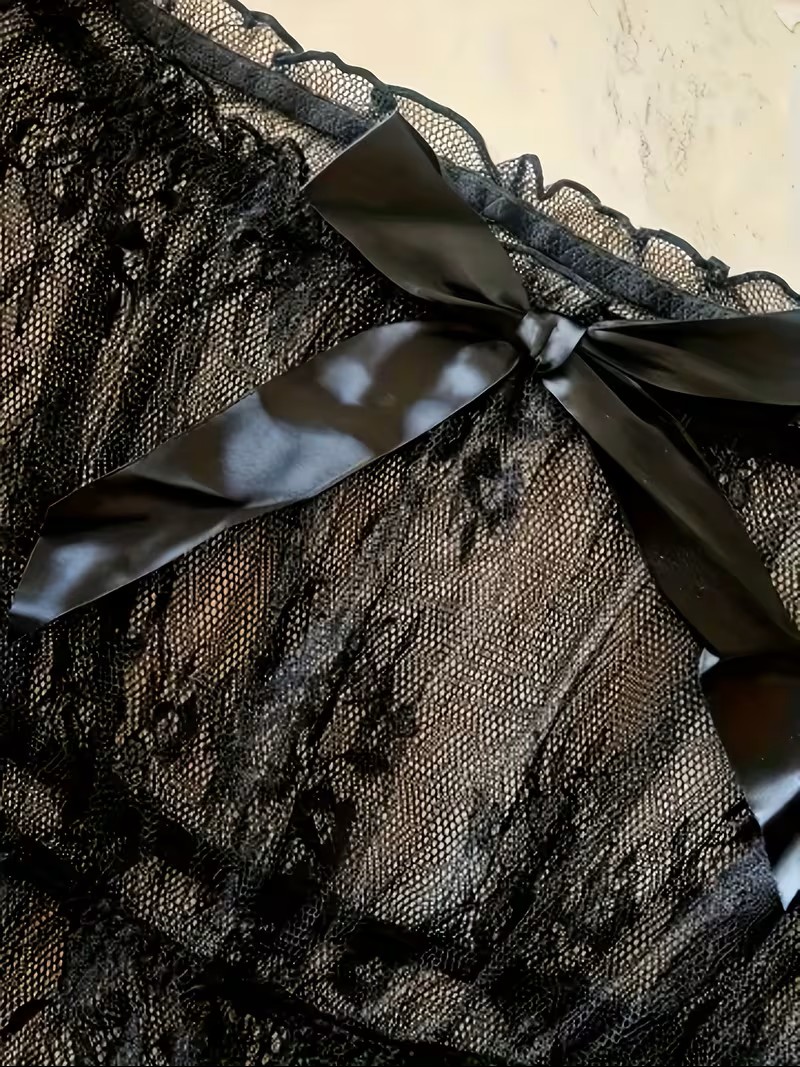 De jurk is afgewerkt met een delicate wimperkanten rand, die een extra vleugje luxe toevoegt. Het opvallende grote strikdetail aan de achterkant (of voorkant) maakt het geheel speels en verleidelijk. Perfect voor een spannende avond, een romantische verrassing of om jezelf gewoon extra zelfverzekerd te voelen.